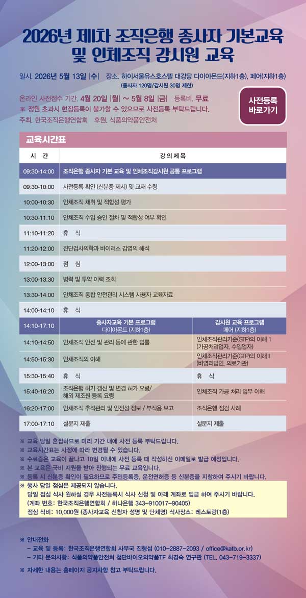사단법인 한국조직은행연합회 주소: (우. 06591) 서울특별시 서초구 반포대로 222 / 가톨릭대학교 서울성모병원 정형외과내 이메일: [email protected] 사업자등록번호: 209-82-10095 Copyright©2009 KATB. All rights reserved.