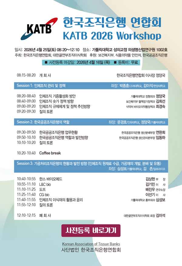 사단법인 한국조직은행연합회 주소: (우. 06591) 서울특별시 서초구 반포대로 222 / 가톨릭대학교 서울성모병원 정형외과내 이메일: [email protected] 사업자등록번호: 209-82-10095 Copyright©2009 KATB. All rights reserved.